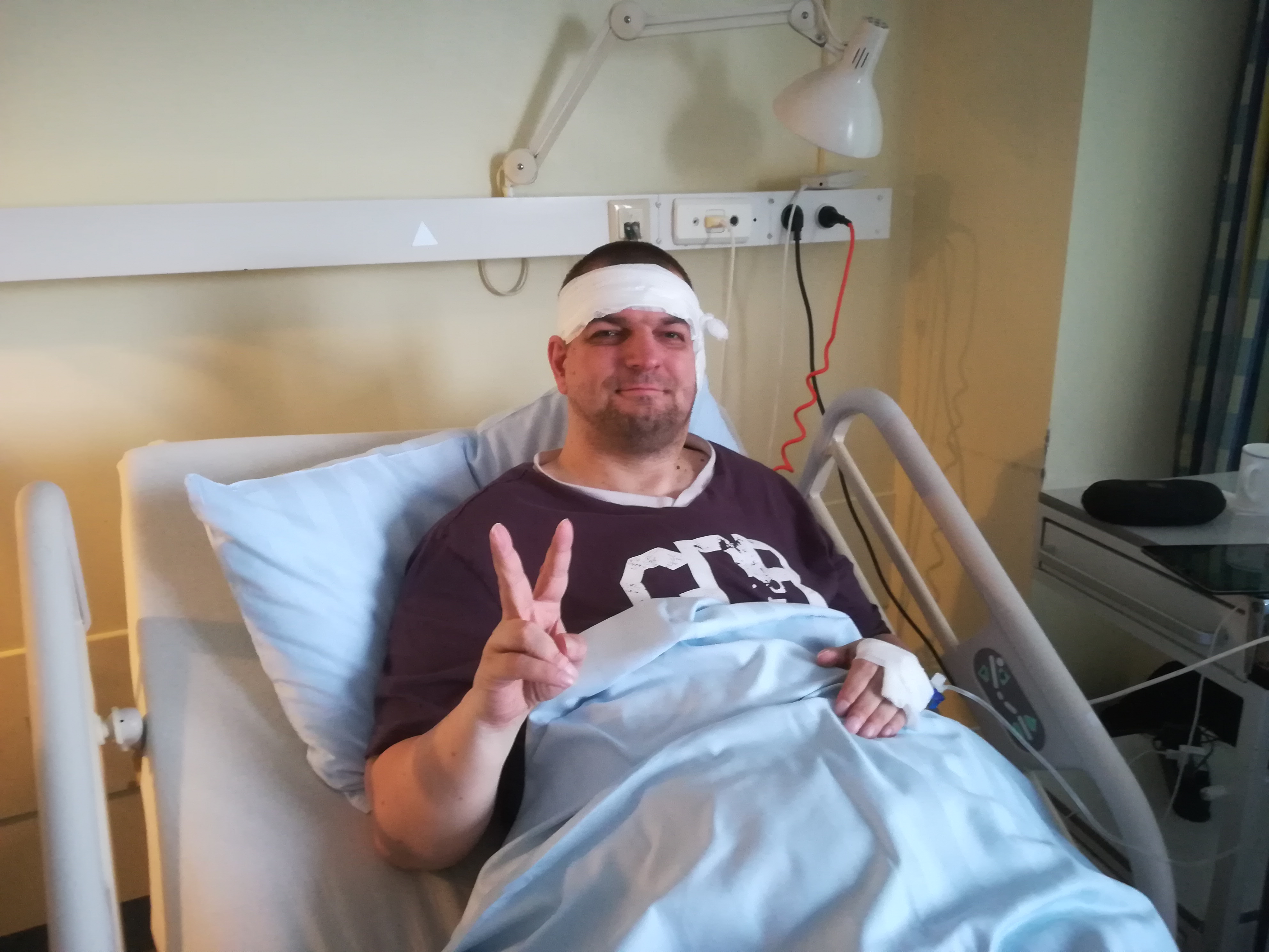 Am nächsten Morgen fiel bekanntlicherweise für mich das Frühstück aus und ich wartete auf das Abholen zum OP-Saal. Nach der Visite bekam ich die "Leck mich am Arsch"-Pille. Um kurz nach 8 Uhr wurde ich zur OP abgeholt. Auf dem Weg zum OP-Saal dauerte es seltsamerweise etwas bis endlich der Aufzug ankam. Ich dachte mir: „Na das kann ja heiter werden, wenn der Aufzug plötzlich streikt“, aber ich nahm es mit Humor und kurz vor dem Eingang des OP-Trakts wartete auch schon Dr. Prentzler. Ich konnte den OP-Saal noch kurz sehen und bekam dann die Narkose per Infusion und ich zählte gerade mal bis drei und war dann ruckartig eingeschlafen.