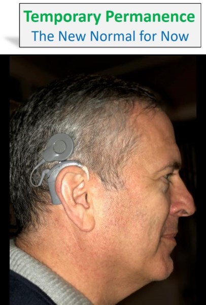 Many of you know that I have two cochlear implants (CI). I had surgery to replace one of them in early December. For 3 weeks, I had absolute silence on one side until I received my processor (the part you see on me in the picture) and it was activated (programmed) for the first time. It was at that moment that I began a new journey into the world of Temporary Permanence in a very big way.