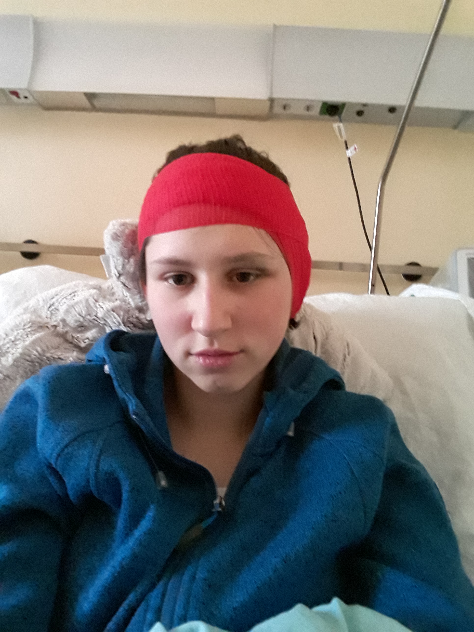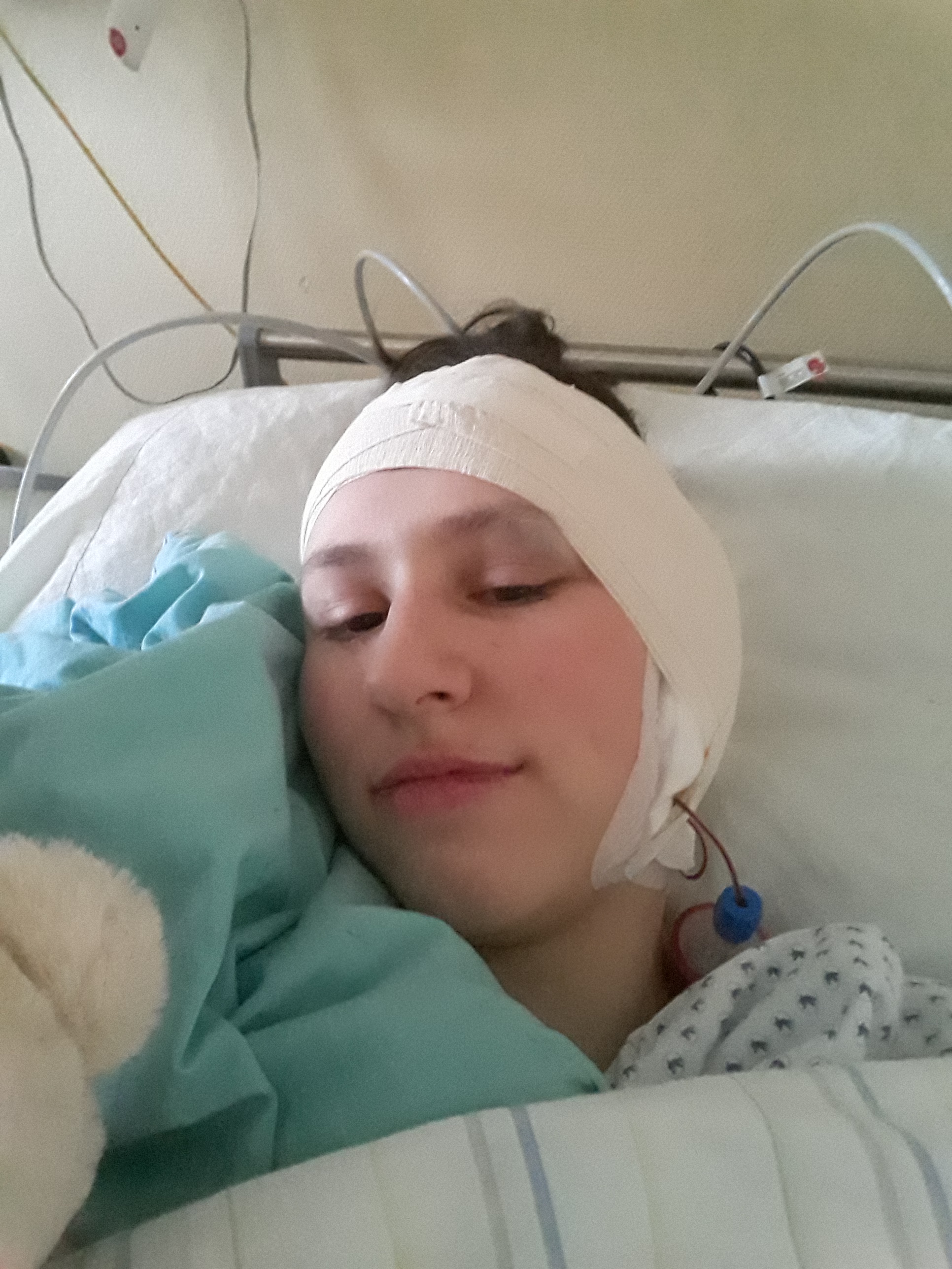 Am nächsten Tag wachte ich auf. Mein Verband war verrutscht, ich sah richtig „bekloppt“ und lustig aus. Mir ging es etwas besser und ich war froh, dass ich die Narkose relativ gut vertragen habe.