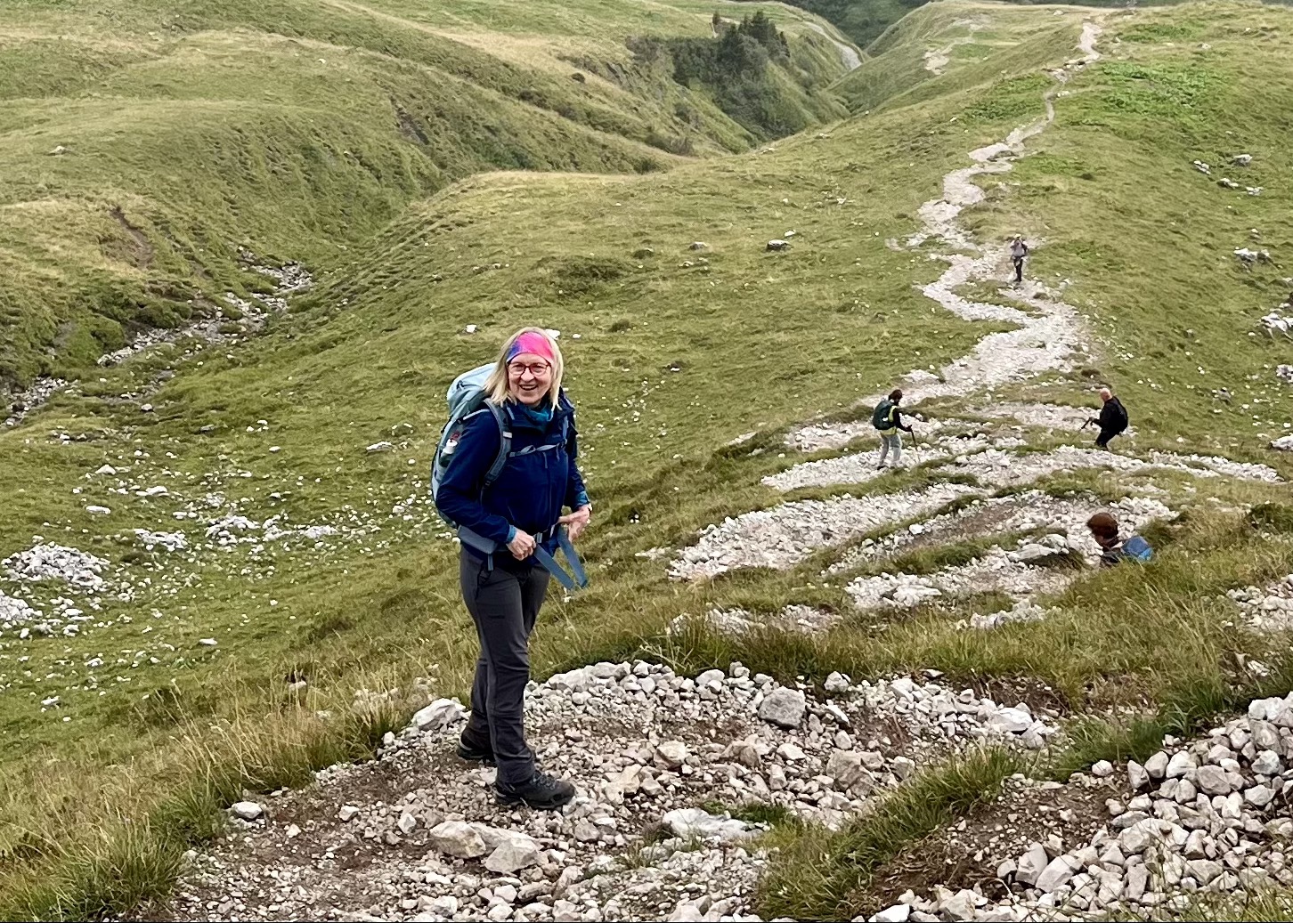 Die Vielfalt für Auge, Geist und Körper war ein Genuss. Und die „Ohren“? Knirschender Kalkstein, das Geräusch beim Halt suchen des Fußes, der Klang der Stöcke anderer Wanderer. Ich selbst genoss es, mich ohne Wanderstöcke frei zu bewegen. Hier kamen mir doch meine regelmäßigen Bergläufe zu Hause an der Bergstraße zugute. Immer mal wieder vorauszulaufen, abseits der Gruppe zu gehen, zu stehen und die Weite der herrlichen Landschaft zu genießen, war möglich und wichtig für mich. Gleichzeitig fühlte ich mich mit der Gruppe „im Rücken“ in Sicherheit, denn ich war nicht erfahren im Hochgebirgswandern. Zudem hatte ich somit Raum von vorne oder von oben manches Foto von der Gruppe zu machen. Dies brachte gemeinsame Freude abends beim Austausch der Bilder.