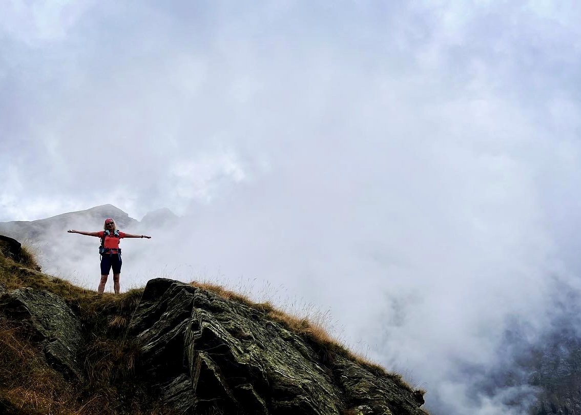 Diese Bergtour war nicht ohne Herausforderungen. Wir mussten uns streckenweise in jedem Moment konzentrieren. Es gab ausgesetzte Wege in steilem Gelände, das im Nebel lag. Etwas Mut und Zuversicht in die eigenen Fähigkeiten gehörten schon dazu, hier ohne Gruppe unterwegs zu sein. Das felsige Gelände mit einem Höhenunterschied von 859 m auf und ab bewältigen wir nach unserer Wanderwoche über die Alpen dann doch insgesamt problemlos, auch ohne Bergführer. Bei dem steilen, manchmal rutschigen Abstieg zeigte sich endlich die Sonne. Es boten sich so herrliche Aussichten ins Tal. Die hellen Glöckchen einer Ziegenherde begleiteten uns. HörGlück!