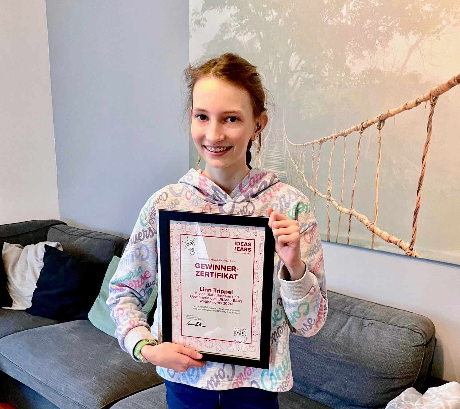 Ihre Ideen hat sie grob mit Bleistift skizziert und sie sind dann erstmal in Vergessenheit geraten. Einen Tag vor Abgabeschluss haben wir das Skizzenblatt in ihrem Zimmer gefunden und in Absprache mit ihr bei Ideas4Ears eingereicht. Wenige Wochen später bekamen wir den Anruf, dass Linn für ihre Ideen zur Deutschland-Gewinnerin gewählt wurde. Der Hauptpreis ist eine dreitägige Reise in die Zentrale von Med-El in Innsbruck. Obwohl sich das von Med-El geplante Rahmenprogramm wirklich herausragend liest, freut sich Linn am allermeisten auf die anderen Gewinnerkinder aus über 13 verschiedenen Ländern der ganzen Welt. Schon jetzt ist der anstehende Besuch ihr Highlight des Jahres.